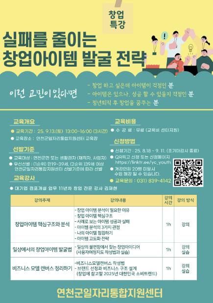 한편, 연천군은 후속 교육으로 9월 13일 ‘실패를 줄이는 창업아이템 발굴 전략’ 특강을 개최할 예정이다. 이번 과정은 창업을 준비하지만 아이템 선정에 어려움을 겪는 이들을 위해 기획됐으며, 창업아이템 핵심구조 분석, 일상에서 아이템 찾기, 비즈니스 모델 캔버스 정리하기 등 실습형 교육을 통해 창업 아이디어를 구체화하는 기회를 제공한다.