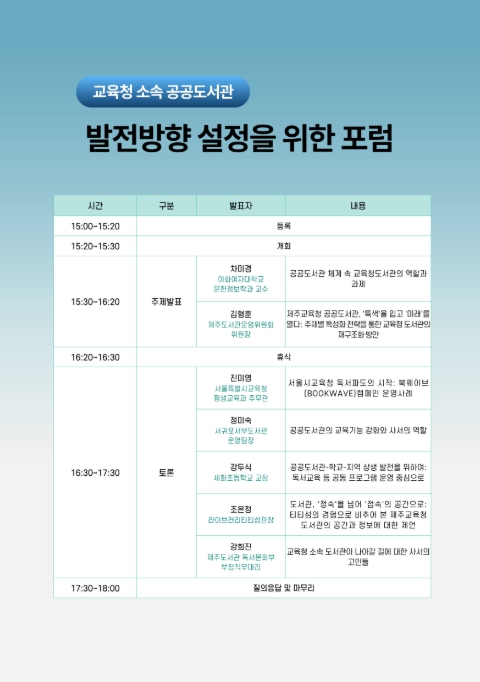 제주도서관 관계자는 “이번 포럼은 교육청 소속 공공도서관의 기능과 역할을 점검하고 강점과 개선 과제를 도출하는 뜻깊은 자리가 될 것으로 기대한다”고 말했다.