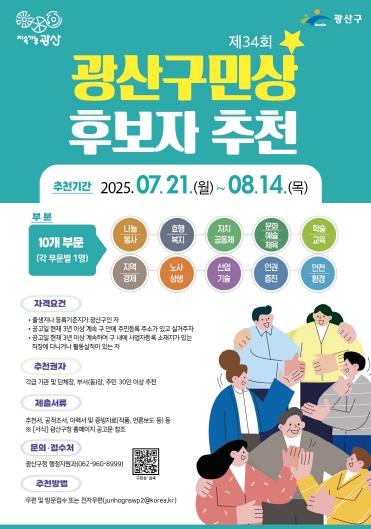 [뉴스노크=김인호 기자] 광주 광산구가 지역사회 발전, 상생공동체 실현에 앞장선 제34회 ‘광산구민상’ 후보자를 공모한다.