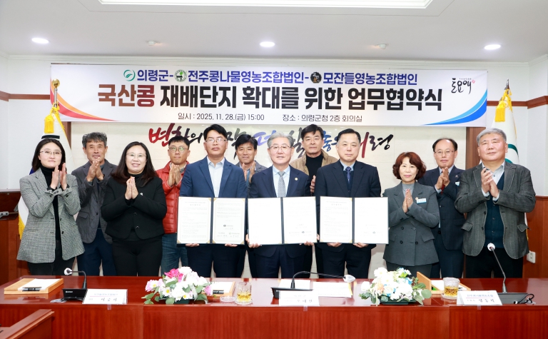 협약식에는 오태완 군수를 비롯해 전주콩나물영농조합법인 양동혁 조합장, 모잔들영농조합법인 이충희 대표 등 관계자 10여 명이 참석했다. 이들은 △의령산 나물콩의 안정적 공급 확대 및 출하량 증대 △품질 개선을 위한 기술 지원과 판로 확대 △생산·가공·유통 분야 연계 협력 등을 추진하기로 뜻을 모았다.