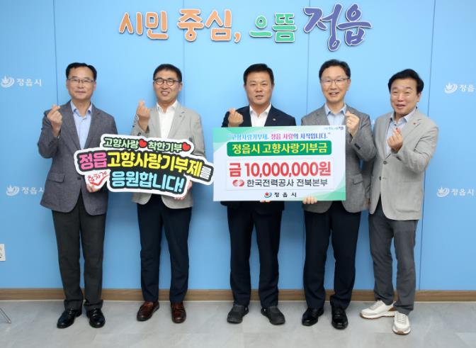 [뉴스노크=김인호 기자] 한국전력공사 전북본부가 정읍시에 고향사랑기부금 1000만원을 전달하며 지역 발전을 위한 따뜻한 응원에 나섰다.
