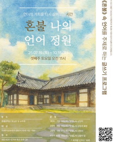 [뉴스노크=김인호 기자] 남원시 혼불문학관이 오는 7월 19일부터 10월 18일까지 매월 셋째 주 토요일 오전 11시, 꽃심관 및 누마루에서 글쓰기 프로그램 ‘혼불 나의 언어 정원’을 운영한다.
