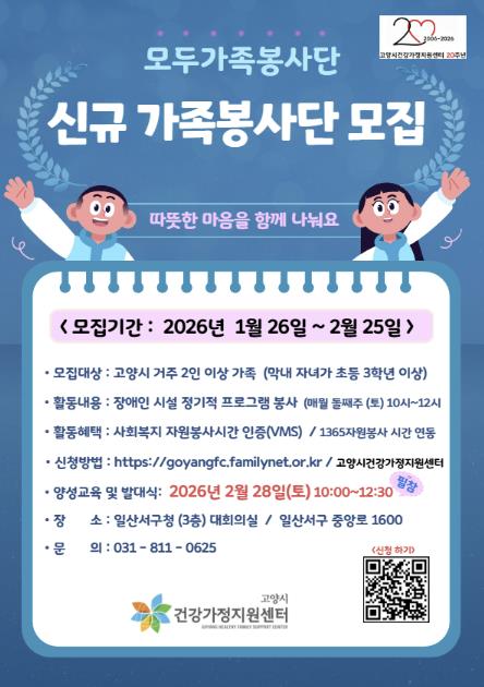 [뉴스노크=김인호 기자] 고양특례시 건강가정지원센터에서는 오는 2월 25일까지 2026년 ‘가족봉사단’참여자를 모집한다.