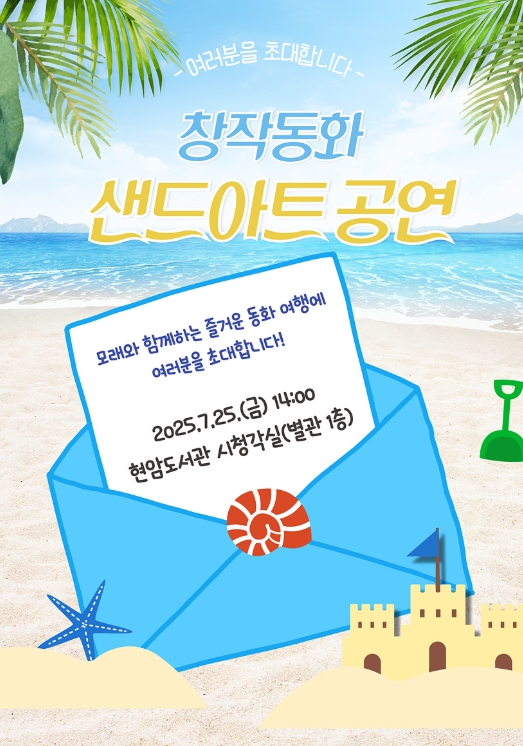 공연은 현암도서관 시청각실에서 진행되며, 창작동화 ‘꾸고’와 ‘아낌없이 주는 나무’를 모래와 빛을 통해 표현해 감동을 전할 예정이다.