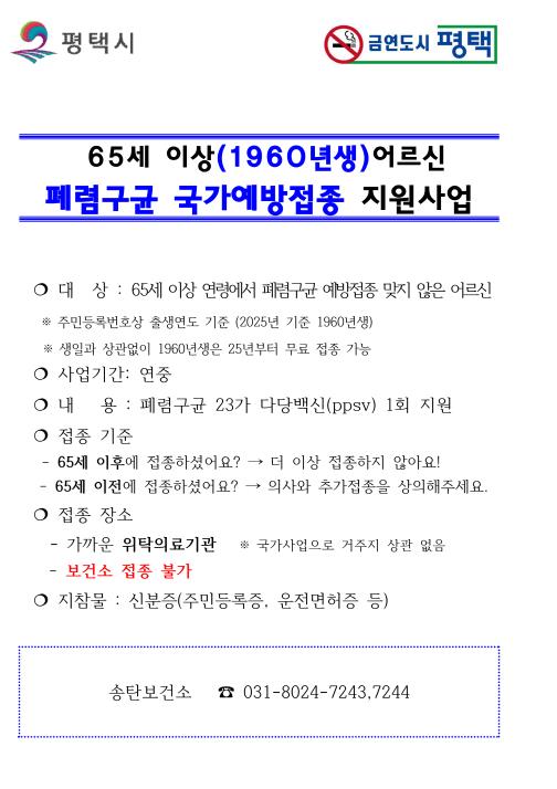 ▲ 평택시, 65세 이상 어르신 대상 폐렴구균 예방접종 지원 |