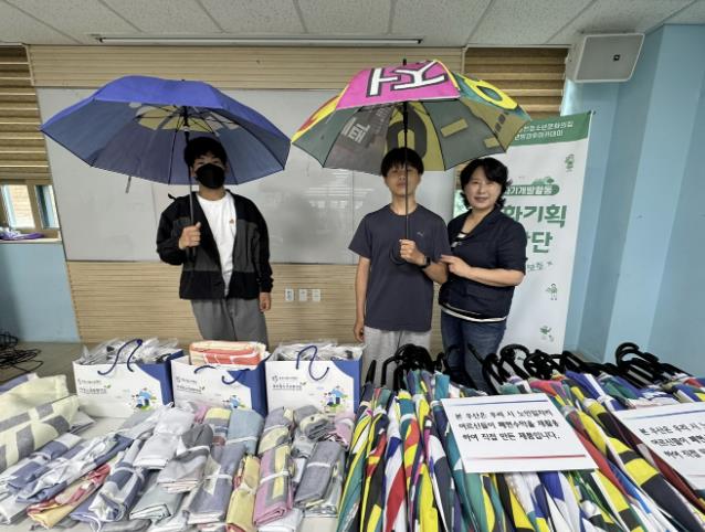 이와 함께 포천청소년문화의집에는 폐현수막을 활용해 제작한 우산 40개와 친환경가방 40개가 기증됐다. 기증된 우산은 포천청소년문화의집을 이용하는 청소년들에게 무료 대여용으로 비치한다.