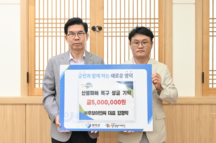 지난 3일, ㈜우보이엔씨(대표 김경락)가 성금 500만 원을 영덕군에 기탁했으며, 전정희 작가와 함께한 6개 기업 (주)코비코코리아, (주)선경, (주)아이씨씨, (주)인천탁주, 법무법인(유)산우, (주)리엔젠도 뜻을 모아 성금 500만 원을 김광열 영덕군수에게 전달했다.