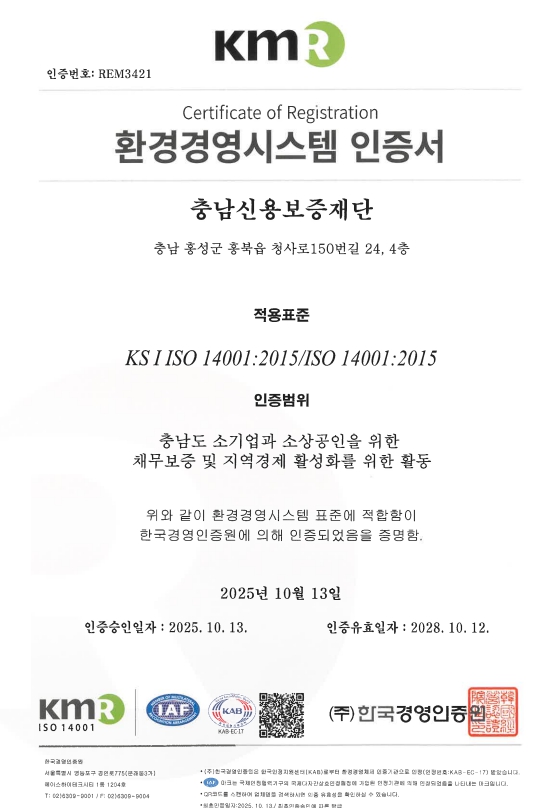 [뉴스노크=김인호 기자] 충남신용보증재단은 한국경영인증원(KMR)으로부터 ISO 14001:2015(환경경영시스템) 인증을 취득했다고 17일 밝혔다.