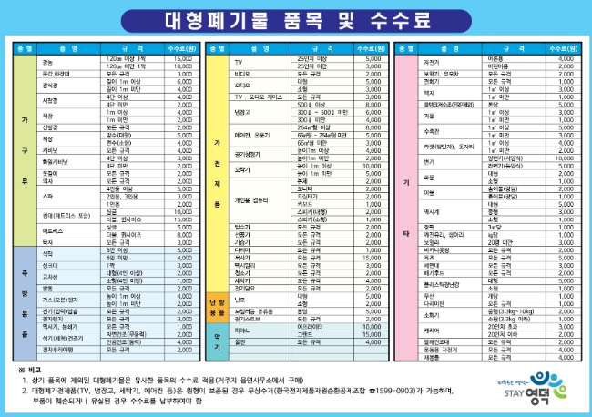 | ▲ 대형폐기물 품목 및 수수료 안내표. |