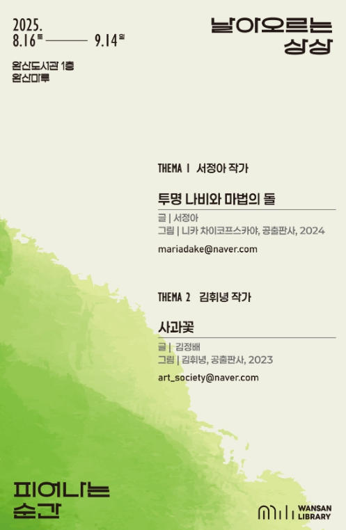 이번 전시에서는 김휘녕 작가(그림)의 그림책 ‘사과꽃’(김정배 글)과 서정아 작가(글)의 ‘투명나비와 마법의 돌’(니카 차이코프스카야 그림)에 수록된 일러스트 50여 점이 전시돼 관람객들은 그림책을 통해 ‘피어나는’ 따뜻한 이야기와 ‘날아오르는 상상’의 자유를 시각적으로 경험할 수 있다.