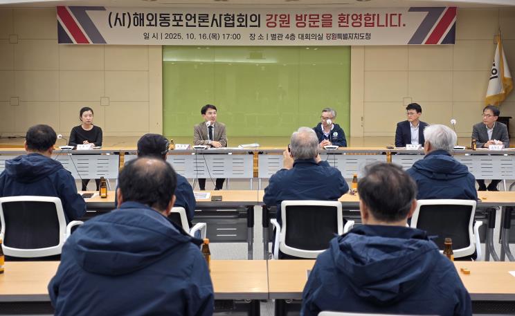 [뉴스노크=김인호 기자] 강원특별자치도는 10월 16일 도청을 방문한 (사)해외동포언론사협회(회장 김훈)와 간담을 갖고, 강원특별자치도의 비전과 주요 정책을 소개하는 한편 재외동포 사회와의 소통을 강화하는 시간을 가졌다.