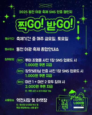 매주 금요일, 토요일에 동천야광축제를 방문하는 방문객들에게 SNS 인증챌린지 ‘찍 GO!, 받 GO!’를 통해 할인 쿠폰을 제공한다.