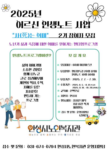 [뉴스노크=김인호 기자] 안성시노인복지관은 7월 7일부터 30일까지 ‘2025년 어르신 인생노트 사업 '사(死)는 의미'’ 2기 프로그램 수강생을 모집한다고 4일 밝혔다.