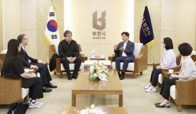 ▲ 조용익 부천시장이 태주솔루션 대표 및 펄벅재단 관계자들과 담소를 나누고 있다. |