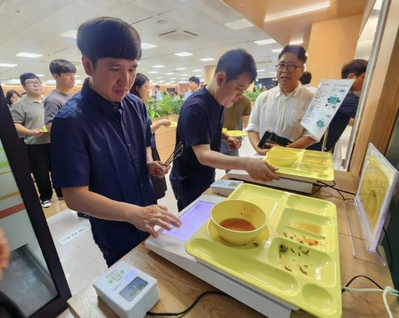 ▲ 구내식당에서 식사 후 직원들이 잔반을 측정하고 있는 모습 |
