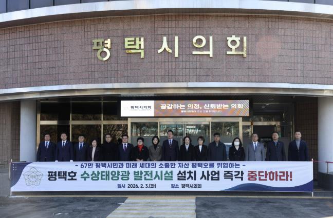 또한 “평택시의회 의원 일동은 평택호를 지켜야 할 책무를 가지고 졸속적이고 일방적으로 추진되고 있는 평택호 수상태양광 발전시설 설치 사업을 즉각 중단할 것 요구한다”고 밝혔다.