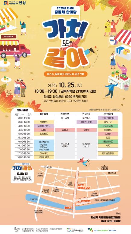 [뉴스노크=김인호 기자] 안성시는 오는 2025년 10월 25일, 안성시내 일원(안성교~안성천변~안성천~6070 추억의거리)에서2025 안성시 공동체 한마당 ‘가치 또 같이’ 를 개최한다.