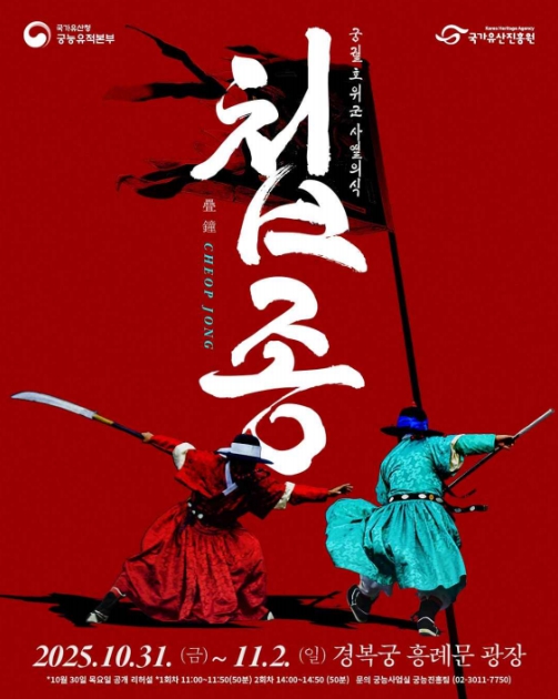 [뉴스노크=김인호 기자] 국가유산청 궁능유적본부는 국가유산진흥원과 함께 10월 31일부터 11월 2일까지 하루 2회(오전 11시, 오후 2시) 경복궁(서울 종로구) 흥례문 광장에서 '2025년 궁궐 호위군 사열의식 ‘첩종(疊鐘)’' 행사를 개최한다.