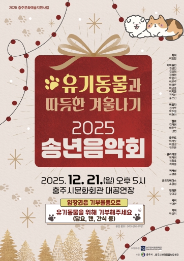 [뉴스노크=김인호 기자] 충주문화관광재단은 오는 12월 21일 오후 5시, 충주시문화회관 대공연장에서 '유기동물과 따듯한 겨울나기 2025 송년음악회'를 개최한다.
