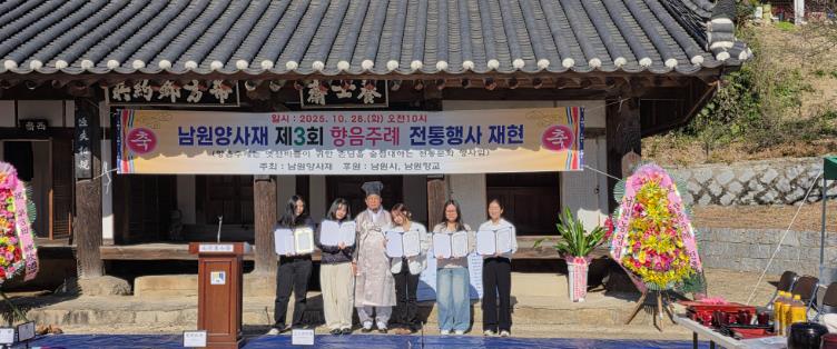 이번 장학금은 남원양사재의 대표행사인 제3회 향음주례 전통 행사 재현회를 기념하여, 학업 여건이 어려운 가운데에서 꿈과 희망을 키워가고 있는 학교 밖 청소년 5명(신○연, 이○연, 이○린, 이○윤, 장○르)을 선정하여 1인당 20만 원씩 수여했다.