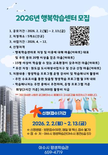 [뉴스노크=김인호 기자] 여수시는 주민 생활권 중심의 평생학습 기회를 확대하기 위해 '2026년 읍·면·동 행복학습센터' 신규 지정 사업에 참여할 마을(아파트)을 모집한다고 밝혔다.