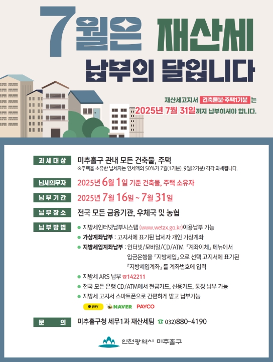 [뉴스노크=김인호 기자] 인천 미추홀구는 7월 정기분 재산세 363억 원(지역자원시설세, 지방교육세 포함)을 부과했다고 10일 밝혔다.