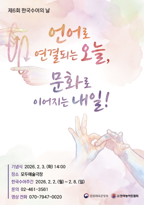 [뉴스노크=김인호 기자] 문화체육관광부는 2월 3일 오후 2시, 모두예술극장에서 ‘한국수어의 날’을 기념해 한국수어의 가치와 중요성을 널리 알리고자 ‘제6회 한국수어의 날’ 기념식을 개최한다.