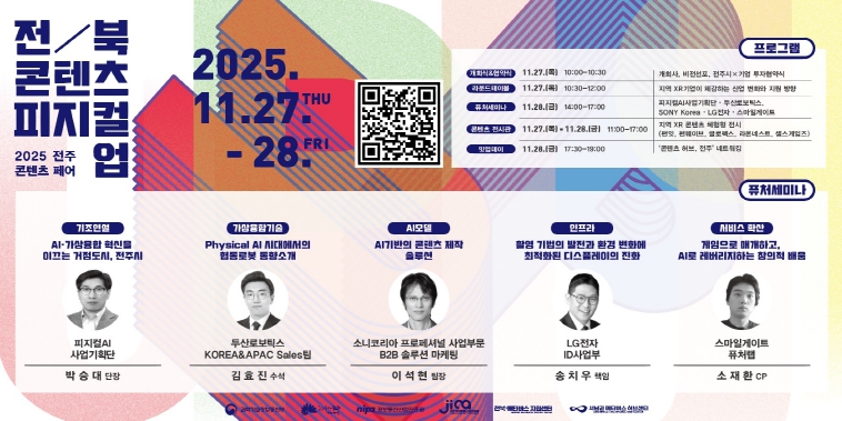 전주시와 과학기술정보통신부, 정보통신산업진흥원(NIPA), 전주정보문화산업진흥원은 오는 27일과 28일 이틀간 전주정보문화산업진흥원 일원에서 가상융합산업 성과공유회인 ‘2025년 제8회 전주 콘텐츠 페어’를 개최한다.