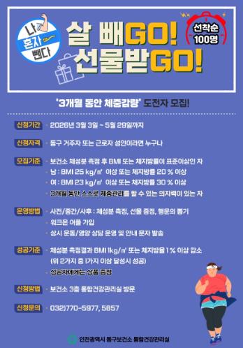 [뉴스노크=김인호 기자] 인천 동구보건소는 주민 스스로 건강한 체중 관리를 할 수 있도록 돕는‘나 혼자 뺀다! 살빼GO! 선물받GO!’프로그램 참여자를 모집한다고 밝혔다.