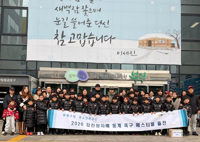 [뉴스노크=김인호 기자] 부평구청 유소년축구단은 전라남도 강진군에서 열리는 ‘2026 강진청자배 동계 축구 페스티벌’ 참가를 앞두고, 5일 구청에서 출정식을 가졌다.