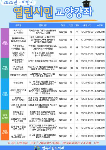 주요 강좌는 △오늘의 글쓰기 등 독서 관련 강좌 △캘리그라피·그린식물테라피 등 취미 강좌 △스마트폰 기초 활용 강좌 △독서지도사·그림책 북큐레이션 등 자격증 취득 과정이 진행된다.