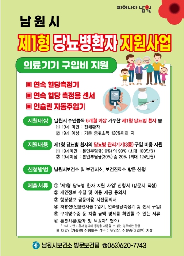 지원 대상은 남원시에 6개월 이상 주민등록주소를 둔 제1형 당뇨병 환자로, 19세 미만은 전체, 19세 이상은 기준 중위소득 120% 이하면 지원받을 수 있다.