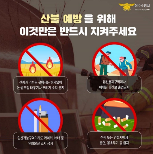 여수소방서는 산불 예방을 위해 시민들에게 다음과 같은 사항을 반드시 지켜줄 것을 당부했다. 주요 내용은 ▲산림과 인접한 지역에서 허가 없는 논·밭두렁 태우기 및 쓰레기 소각 금지 ▲입산통제구역 및 폐쇄된 등산로 출입 금지 ▲입산 가능 구역이라도 라이터, 버너 등 인화물질 소지 금지 ▲산림 또는 인접 지역에서 흡연 및 담배꽁초 투기 금지 등이다.