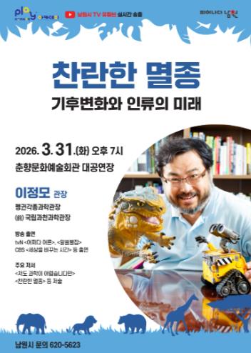 남원시 대표 교양 프로그램인 플레이(Play)남원 아카데미의 일환으로 마련된 이번 강연에서 이 관장은 다소 무겁고 어렵게 느껴질 수 있는 ‘멸종’과 ‘기후변화’라는 화두를 특유의 유머와 명쾌한 입담으로 풀어낼 예정이다.