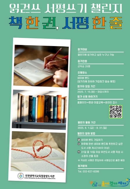 이번 챌린지는 인천 시민 누구나 참여할 수 있으며, 참여 신청은 7월 15일부터 중앙도서관 누리집에서 가능하다.