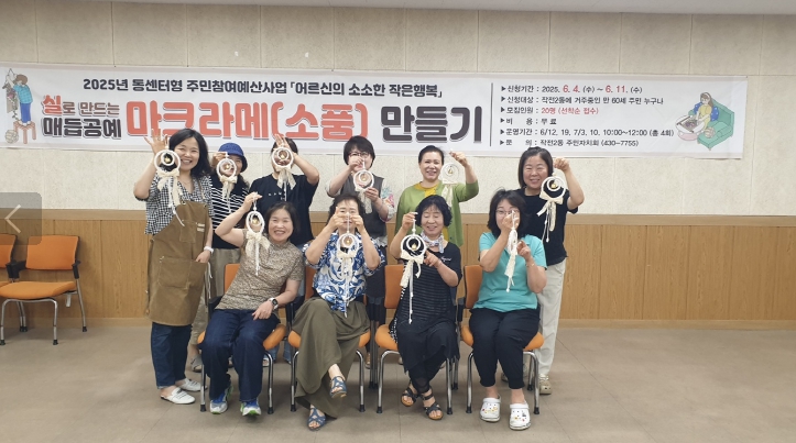 이번 프로그램은 주민참여예산사업으로 운영됐으며, 60세 이상 어르신들이 직접 참여해 실로 만드는 소품 공예를 배우며 성취감과 여가의 즐거움을 느낄 수 있도록 기획됐다.