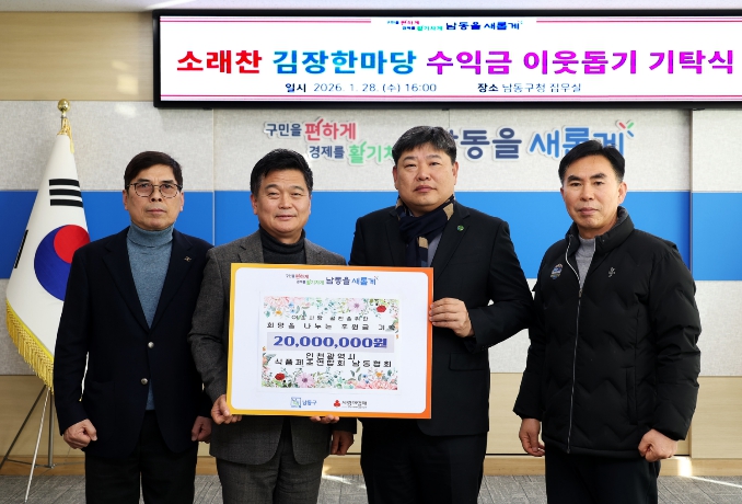[뉴스노크=김인호 기자] 인천시 남동구는 최근 (사)인천식품제조연합 남동구협회로부터 ‘2025년 남동구 소래찬 김장한마당’ 판매 수익금 총 2천만 원을 기탁받았다고 30일 밝혔다.