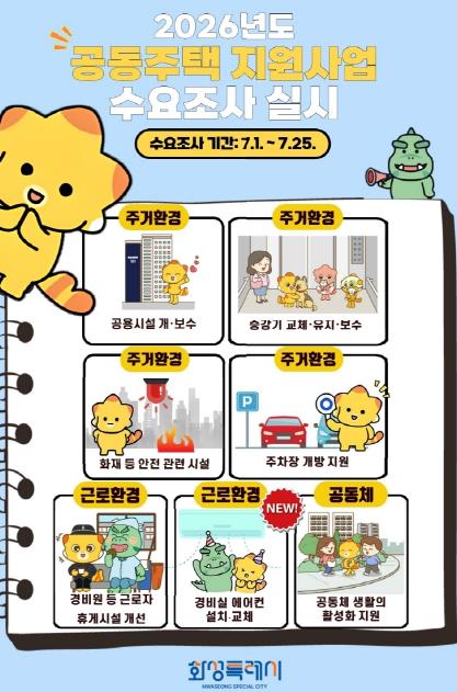 [뉴스노크=김인호 기자] 화성특례시가 오는 25일까지 관내 공동주택을 대상으로 2026년도 공동주택 지원사업 추진을 위한 수요조사를 실시한다.