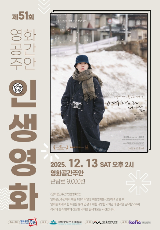 한편, 영화공간주안의 ‘인생 영화’ 프로그램은 매월 한 편의 다양성·예술영화를 선정해 상영한 뒤, 관객과의 대화를 통해 삶과 행복에 관한 가치관을 나누는 관람 프로그램으로 꾸준한 호응을 얻고 있다.