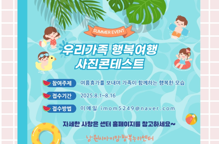 남원시 아이맘행복누리센터(센터장 곽미라)는 “이번 행사를 통해 영유아들이 남원시에서 즐거운 여름방학 추억을 만들 수 있기를 희망한다”라고 밝혔다.