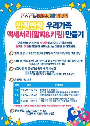 [뉴스노크=김인호 기자] 강화군시설관리공단(이사장 박영길)은 오는 26일, 강화행복 키즈카페 남부점에서 ‘반짝반짝 우리 가족 액세서리(팔찌&키링) 만들기’ 프로그램을 운영한다고 밝혔다.