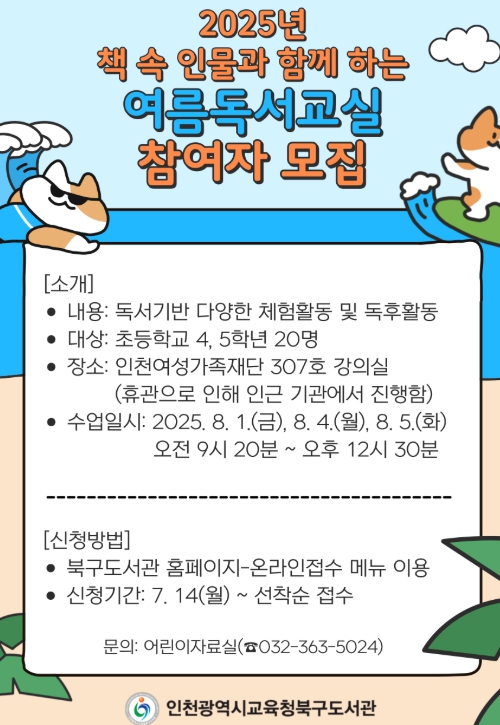 [뉴스노크=김인호 기자] 인천광역시교육청북구도서관은 여름방학을 맞아 초등학교 4·5학년을 대상으로 8월 1일부터 5일까지 3일간 ‘여름독서교실’을 운영한다.
