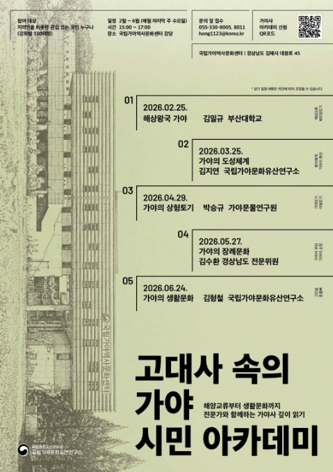 [뉴스노크=김인호 기자] 국가유산청 국립문화유산연구원 국립가야문화유산연구소는 2월부터 6월까지 매월 마지막 주 수요일, 국립가야역사문화센터 강당(경남 김해시)에서 시민들을 대상으로 '고대사 속의 가야' 시민 아카데미를 개최한다.