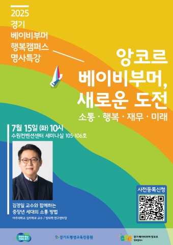 중장년 세대의 소통 방법을 다룰 예정으로, 경기 베이비부버 행복캠퍼스 참여자를 비롯해 경기도 중장년이라면 누구나 들을 수 있다. 신청은 포스터 내 큐알 코드를 스캔하거나 경기도평생교육진흥원 누리집(gg4060.or.kr)을 참고하면 된다.