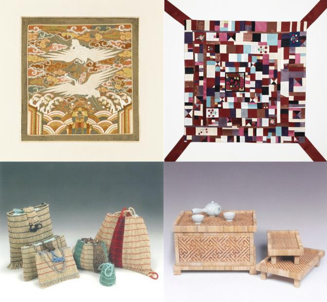 | ▲ 2025년 화성특례시 공예명장 공예품(윗줄 김애경 대표의 쌍학흉배·혼례용보자기 작품, 아랫줄 김은자 대표의 초경공예 손가방·다기함 작품) |