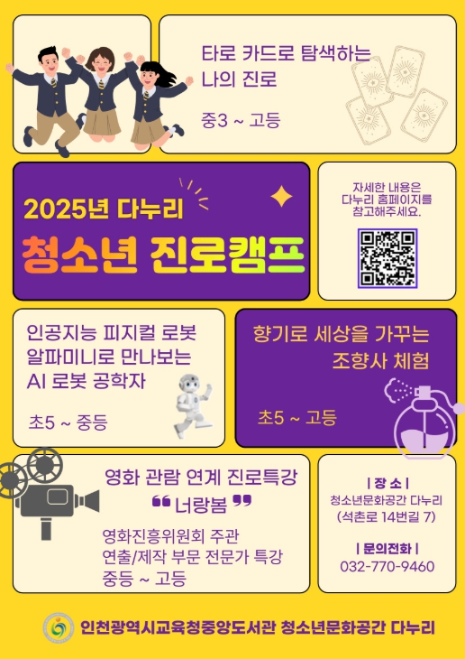 [뉴스노크=김인호 기자] 인천광역시교육청중앙도서관 청소년문화공간 다누리는 7월 26일 오후 1시부터 5시까지 청소년들이 적성과 흥미를 탐색하고 다양한 진로 분야를 체험할 수 있도록 ‘2025년 다누리 청소년 진로캠프’를 운영한다.