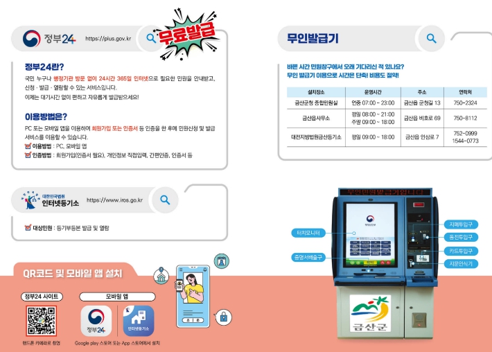 무인민원발급기는 금산읍행정복지센터 내 설치돼 있으며 평일 오전 9시부터 오후 9시까지 이용할 수 있고 수수료는 창구 수수료의 50%다.