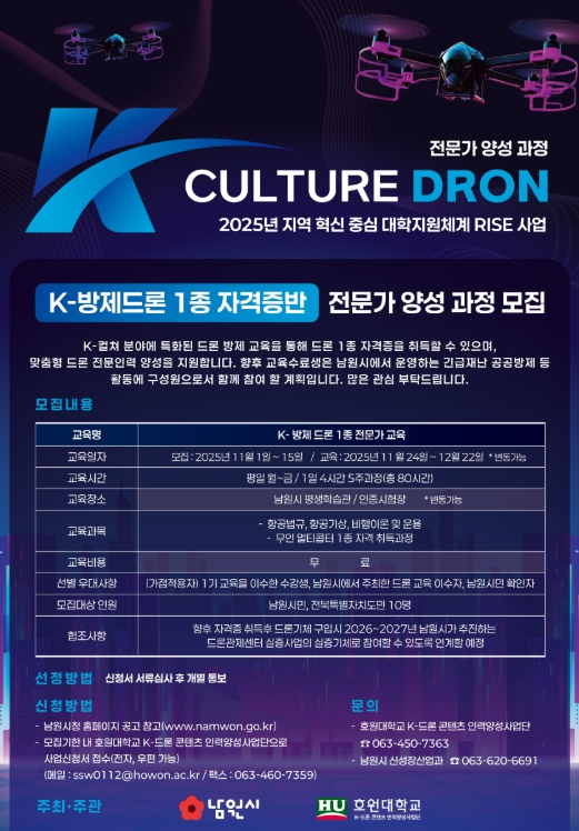 최경식 남원시장은 “이번 교육을 통해 단기-중기-장기 단계별 인력 양성 로드맵을 구축해 지역 드론 산업 생태계를 더욱 탄탄히 조성하겠다”고 밝혔다.