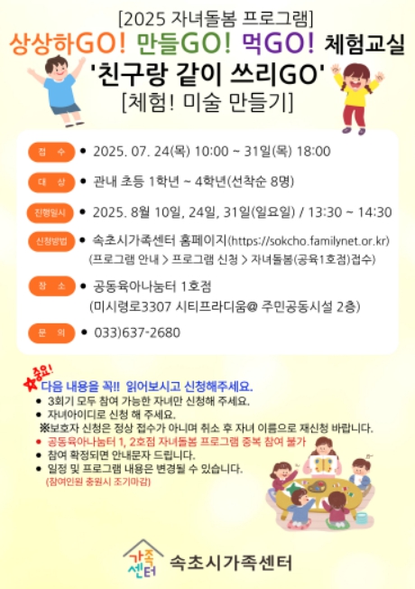 [뉴스노크=김인호 기자] 속초시가족센터는 오는 8월 10일부터 11월 16일까지 약 4개월간 관내 초등학교 1~4학년 아동을 대상으로 ‘2025년 자녀돌봄 프로그램’을 운영한다.
