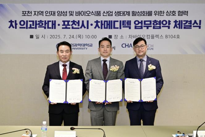 ▲ 포천시–차의과학대–차메디텍, 바이오식품 산업 육성 위한 3자 업무협약 체결 |